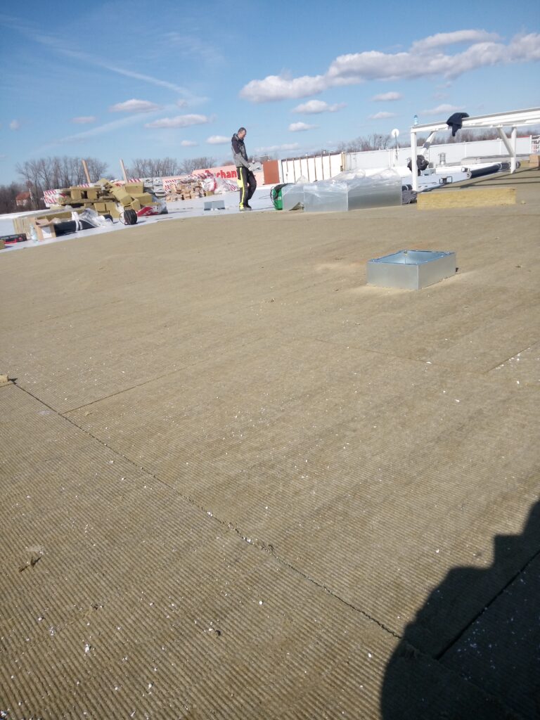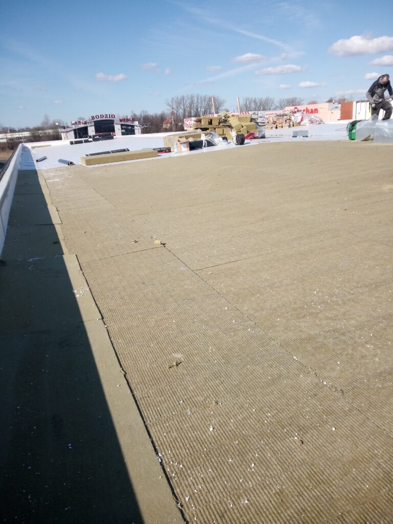 Montaż termoizolacji – warstwa podstawowa i kontr spadki z wełny.