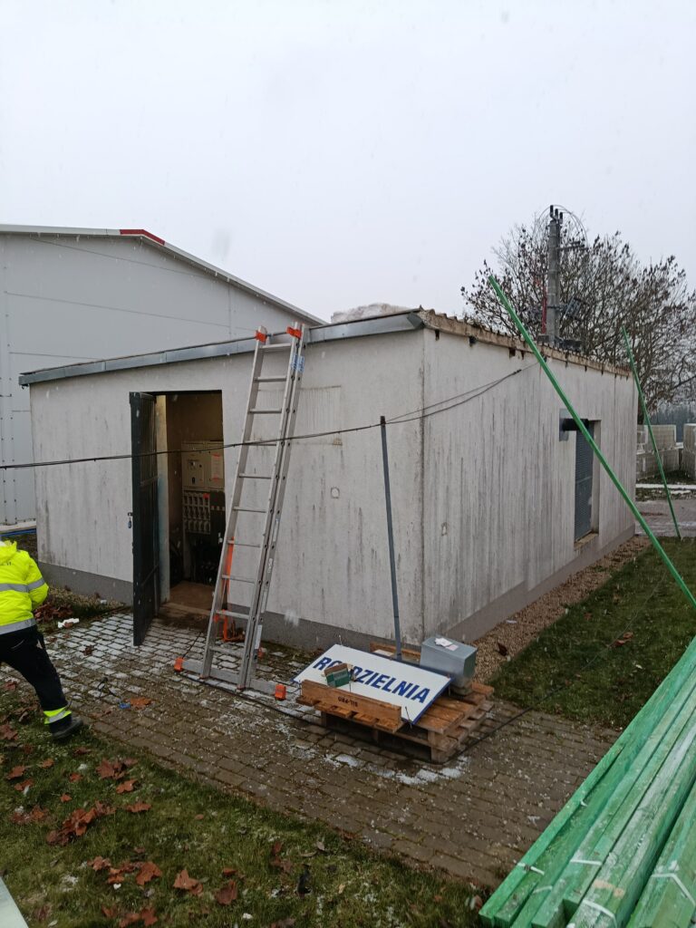 Termomodernizacja budynku polegająca na montażu płyty warstwowej na zewnętrznej stronie ścian oraz wykonaniu nowego pokrycia dachowego.
